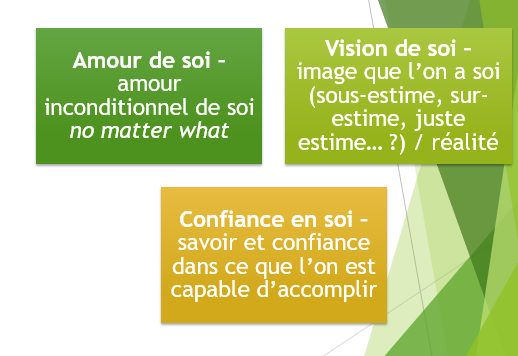 Pour Christophe André, l’estime de soi est fondée sur le triade suivante : amour de soi, vision de soi et confiance en soi.